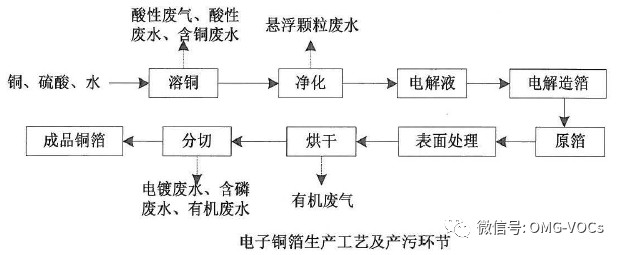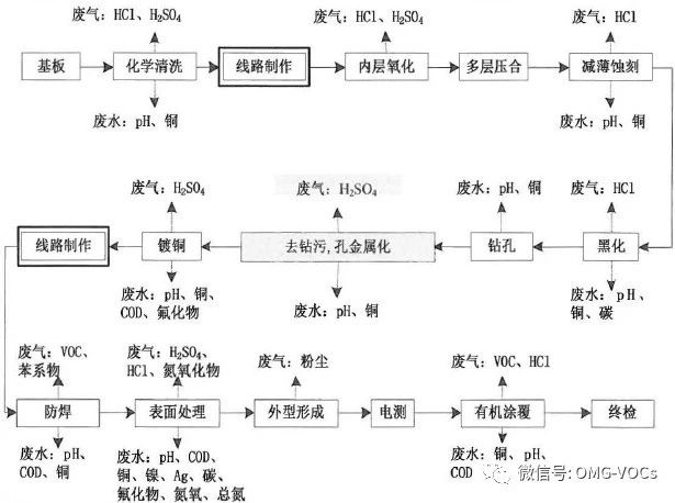 覆铜板生产工艺属于无水工艺,除冷却水、检验检测部门会产生少量污水外,其他生产流程不会产生污水。生产过程产生的污染物主要在废气方面,较多来自于使用丙酮、甲苯等有机溶剂的挥发。