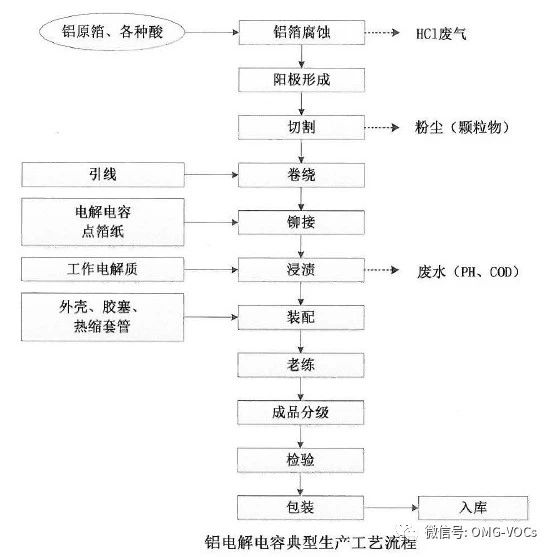 铝电解电容器生产准备阶段要进行抛光处理, 去边缘毛刺时产生少量粉尘;铝箔腐蚀时会产生盐酸气体,切割会产生少量粉尘。