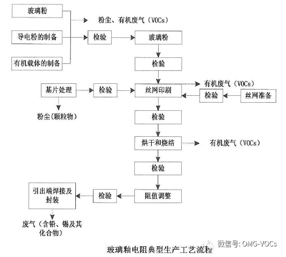 玻璃轴电阻器生产过程中,有机载体的制备、丝网印刷、烘干烧结及引出端焊接有VOCs废气产生。