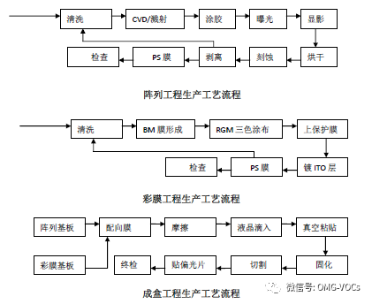完整的TFT-LCD 生产工艺流程主要包括阵列工程( Array) 、彩膜工程(CF) 、成盒工程(Cell ) 三大部分。