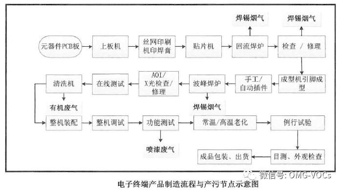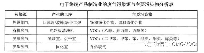 电子终端产品制造行业废气排放潜在的污染物主要是锡和锡化合物、铅和铅化合物及VOCs (苯系物与乙醇、异丙醇、丙酮等) 。