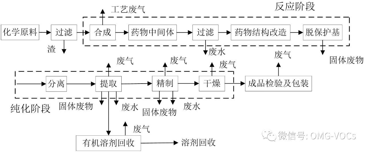 制药行业属于精细化工行业,其特点为生产品种多,生产工序长,使用原料种类多、数量大,原材料利用率低,导致制药行业生产过程产生的“三废”量大,废物成分复杂,污染危害严重。制药工艺中往往需要采用有机溶剂对药品进行分离和提取,因此VOCs 是制药工业中最主要的大气污染物之一。
