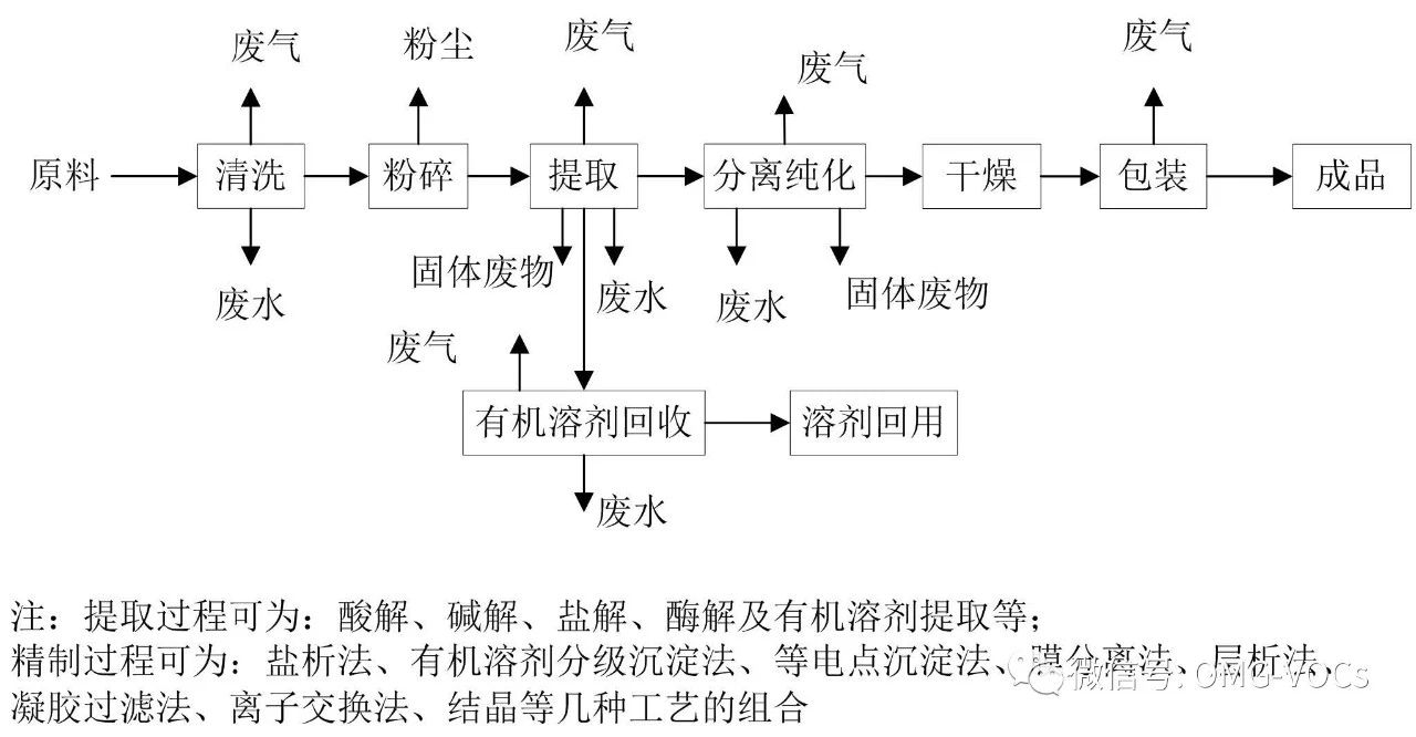 提取类生产过程中的大气污染物主要来自清洗、粉碎、干燥和包装时产生的粉尘;在提取工段中常用的溶剂包括水、稀盐、稀碱、稀酸、有机溶剂(如乙醇、丙酮、三氯甲烷、三氯乙酸、乙酸乙酯、草酸、乙酸等),在提取、沉淀、结晶过程中均会涉及到有机溶剂的挥发,在酸解、碱解、等电点沉淀、pH 调解等过程中还会涉及到酸碱废气的挥发。