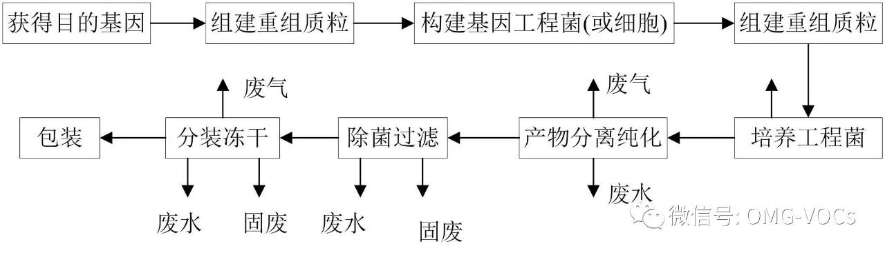 生物工程类生产工艺废气主要来自溶剂的使用,包括甲苯、乙醇、丙醇、丙酮、甲醛和乙腈等,主要产污点为瓶子洗涤、溶剂提取、多肽合成仪等的排风以及实验室的排气、制剂过程中的药尘等。发酵过程中也会产生少量细胞呼吸气,主要成分是CO2 和N2。