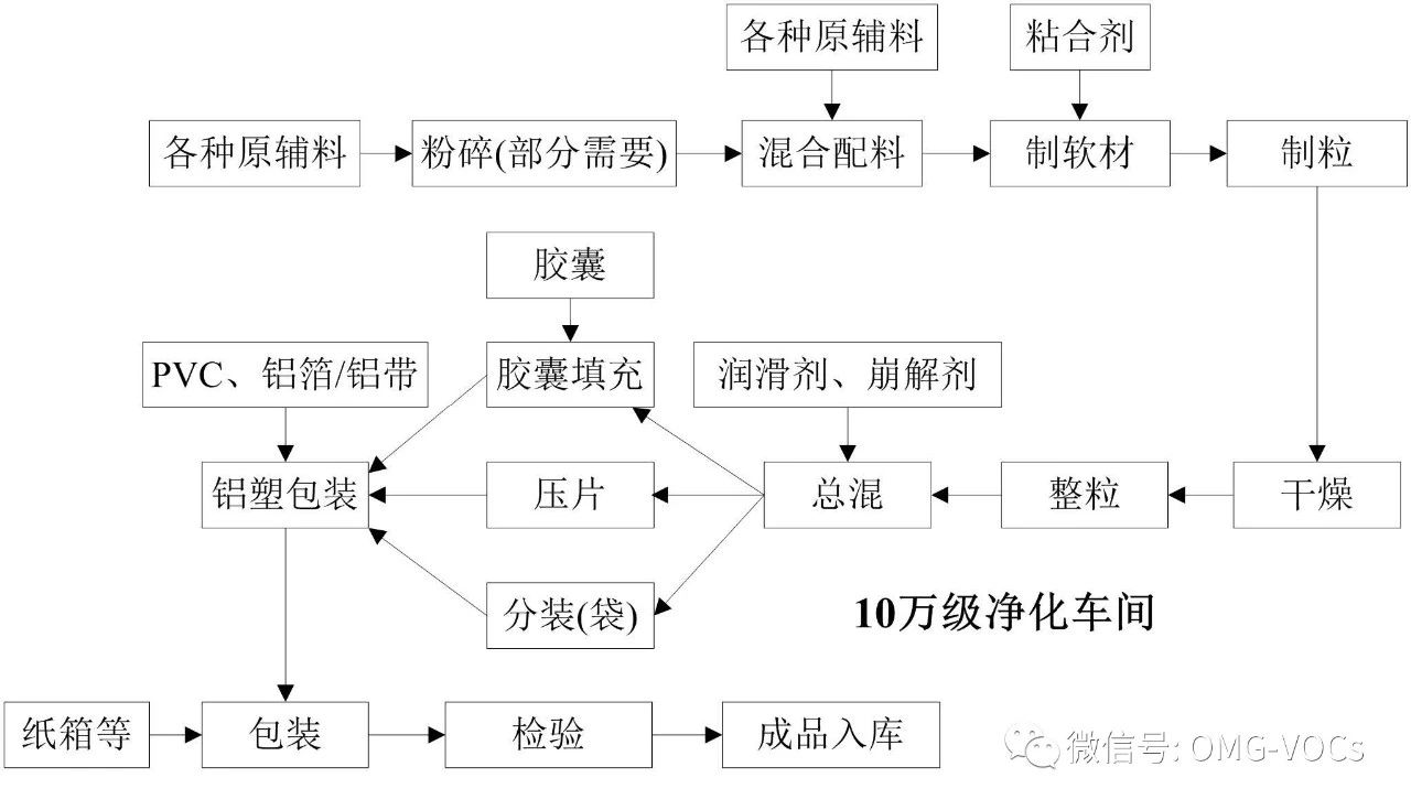 用药物活性成分和辅料通过混合、加工和配制,形成各种剂型药物。制剂药物按剂型可分为固体制剂类、注射剂类和其他制剂类等。固体制剂类和注射剂类生产过程中废气污染源主要为粉尘。