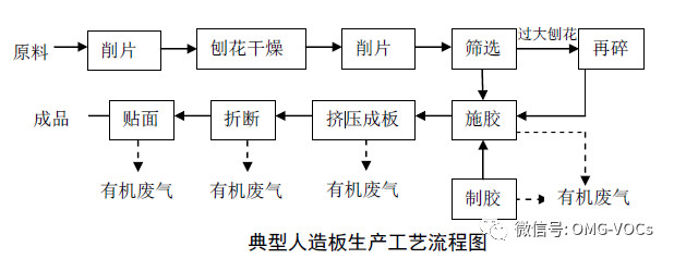 人造板加工行业VOCs废气主要来源于以下环节:(1)胶合板VOCs的排放主要在单板干燥过程及制胶、施胶、热压过程;(2)刨花板主要为涂料、热压和锯边过程中产生的甲醛等;(3)中密度纤维板有机废气主要包括热磨制浆过程产生的有机废气、施胶和纤维干燥过程产生的有机物、纤维板热压过程产生的有机废气。