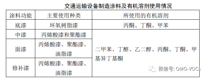 交通运输设备制造过程中最大的产 VOCs 环节是涂装工艺。底涂普遍采用阴极电泳涂装,中涂、面涂少数企业使用水性涂料涂装,多数为溶剂型涂料涂装。