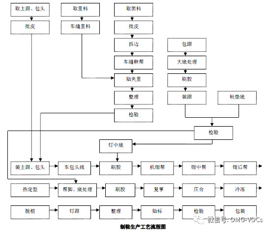 (5)鞋底中底贴合、鞋面鞋底粘胶成型过程使用的粘胶剂,最初粘胶剂所使用的溶剂是苯,后改用甲苯作溶剂。同时还有使用酮类酯类做溶剂的聚氨酯胶粘剂。由于粘胶剂中有机溶剂含量较高,所以是制鞋过程中有机废气排放最多的环节。
